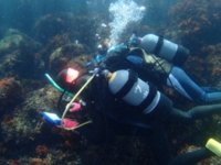 スキューバダイビングでの注意点や呼吸法などの説明を受けた後、タンクを背負ってダイビング!!